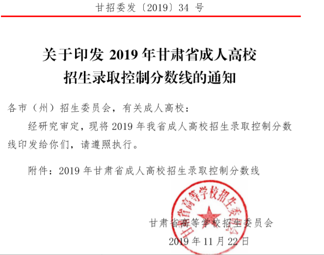 2019甘肃省成人高校招生录取控制分数线